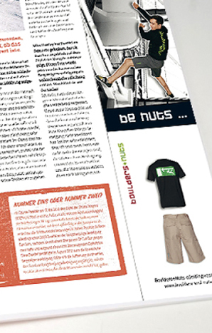 "Really nuts" unter diesem Motto stand das Marketing und die Kommunikation meines im Jahre 2006 gegründeten Labels boulders+nuts. Was als Experiment etwas Schwung in die verstaubte Kletterbekleidungsszene zu bringen begann, entwickelte sich schnell zu einer ernst zu nehmenden Aufgabe. Ich betreute es mit Leidenschaft und Enthusiasmus im gesamten Umfang vom Vertrieb, über die Kommmuni-kation bis hin zum Bau des Messestand, als Ein-Frau-Unternehmen.